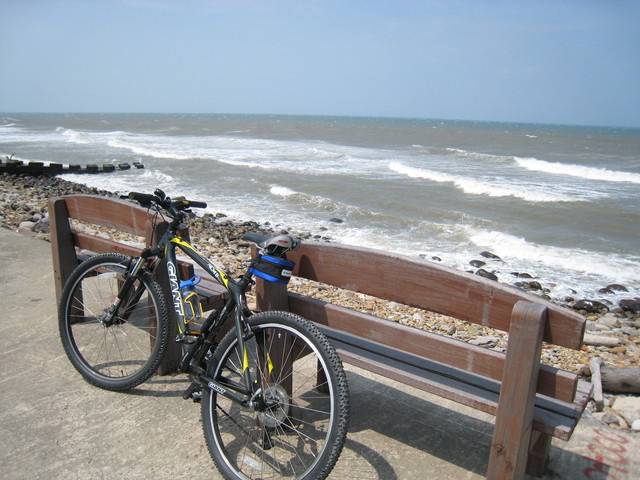 把單車搬到堤防上,讓它也享受這強烈的海風,欣賞這無盡的海洋